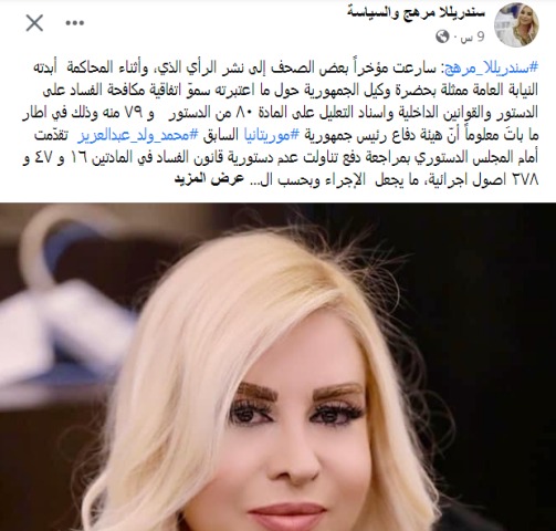 دونت المحامية اللبنانية سندريللامرهج على صفحتها في الفيس بوك فقالت : سارعت مؤخراً بعض الصحف إلى نشر الرأي الذي، وأثناء المحاكمة أبدته النيابة العامة ممثلة بحضرة وكيل الجمهورية حول ما اعتبرته سموّ اتفاقية مكافحة الفساد على الدستور والقوانين الداخلية واسناد التعليل على المادة ٨٠ من الدستور و ٧٩ منه وذلك في اطار ما باتَ معلوماً أنّ هيئة دفاع رئيس جمهورية موريتانيا السابق محمدولد_عبدالعزيز تقدّمت أمام المجلس الدستوري بمراجعة دفع تناولت عدم دستورية قانون الفساد في المادتين ١٦ و ٤٧ و ٢٧٨ اصول اجرائية، ما يجعل الإجراء وبحسب الناشرين سراباً ووهماً.