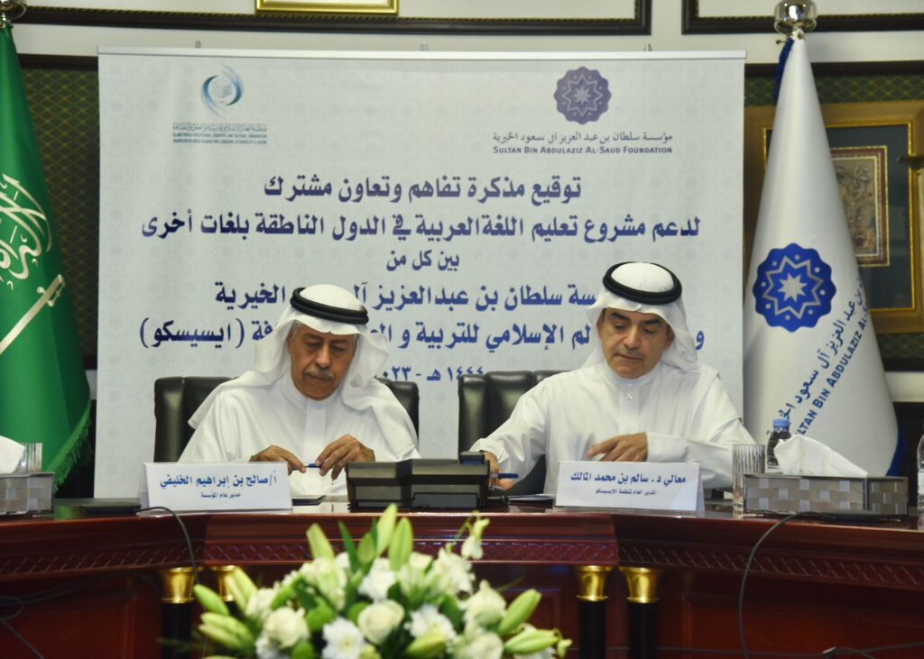 وقعت منظمة العالم الإسلامي للتربية والعلوم والثقافة (إيسيسكو) ومؤسسة الأمير سلطان بن عبد العزيز آل سعود الخيرية بالمملكة العربية السعودية، مذكرة تفاهم وتعاون مشترك لدعم مشروع تعليم اللغة العربية في الدول الناطقة بلغات أخرى، من خلال تحسين الأداء التربوي للعاملين في مجال اللغة العربية للناطقين بغيرها، واستثمار أفضل للتكنولوجيات التعليمية، وزيادة وتيرة النشر الأكاديمي باللغة العربية في الجامعات غير العربية.