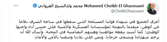 تقدم الرئيس محمد ولد الغزواني بالتعزية للجميع “في شهداء قواتنا المسلحة الذين سقطوا في ساحة الشرف دفاعا عن الوطن”.