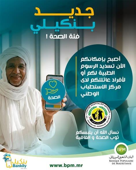 أعلن البنك الشعبي الموريتاني عن إضافة خدمة جديدة للخدمات المتاحة عبر تطبيق "بنكيلي" تتمثل في إمكانية دفع الرسوم الطبية عبره.