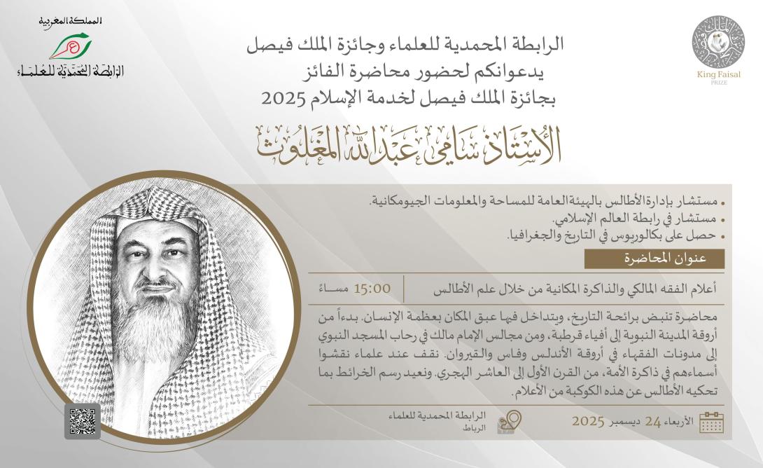 جائزة الملك فيصل، بالتعاون مع الرابطة المحمدية للعلماء بالمملكة المغربية، مساء يوم الأربعاء 24 ديسمبر 2025، في مقر الرابطة بالعاصمة الرباط، محاضرة علمية بعنوان "أعلام الفقه المالكي والذاكرة المكانية من خلال علم الأطالس".