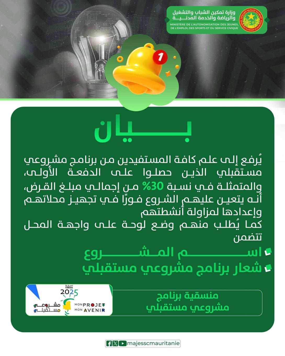 يُرفع إلى علم كافة المستفيدين من برنامج مشروعي مستقبلي الذين حصلوا على الدفعة الأولى، والمتمثلة في نسبة 30% من إجمالي مبلغ القرض، أنه يتعين عليهم الشروع فورًا في تجهيز محلاتهم وإعدادها لمزاولة أنشطتهم.