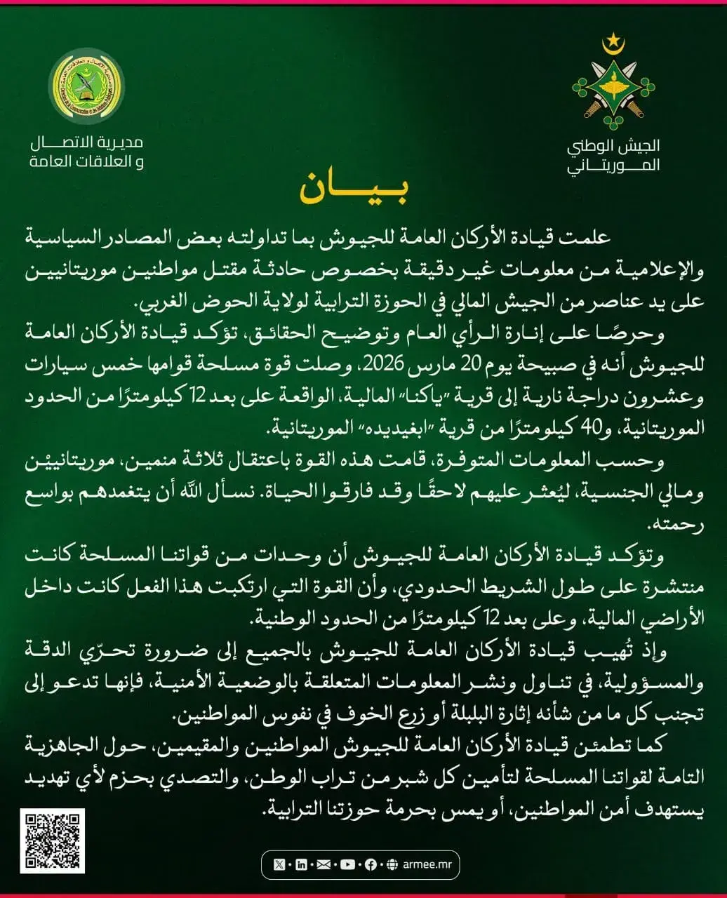 أكّد الجيش الموريتاني مقتل ثلاثة منمين بينهم مواطنان اثنان من موريتانيا داخل الأراضي المالية يوم الـ20 مارس الجاري.