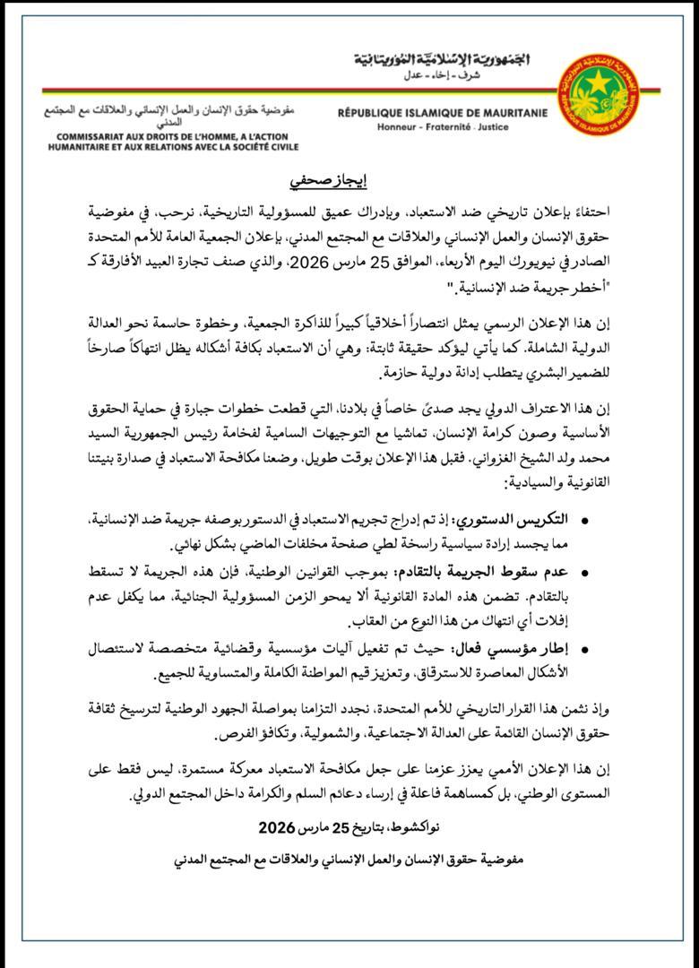 احتفاءً بإعلان تاريخي ضد الاستعباد، وبإدراك عميق للمسؤولية التاريخية، نرحب، في مفوضية حقوق الإنسان والعمل الإنساني والعلاقات مع المجتمع المدني، بإعلان الجمعية العامة للأمم المتحدة الصادر في نيويورك اليوم الأربعاء، الموافق 25 مارس 2026، والذي صنف تجارة العبيد الأفارقة كـ "أخطر جريمة ضد الإنسانية".