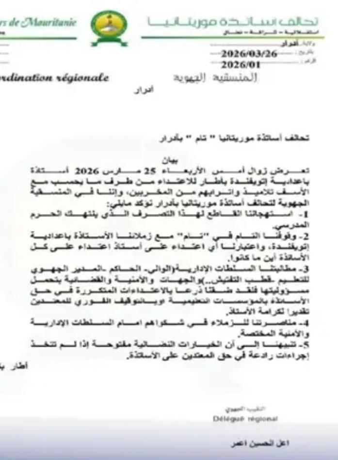 أدان تحالف أساتذة موريتانيا “تام” بولاية آدرار، في بيان صادر بتاريخ 26 مارس 2026، حادثة الاعتداء التي تعرضت لها أستاذة بإعدادية إتويفندة بمدينة أطار، زوال أمس الأربعاء 25 مارس، من طرف مجموعة وُصفت بأنها من التلاميذ ومن يرافقهم من المخربين.