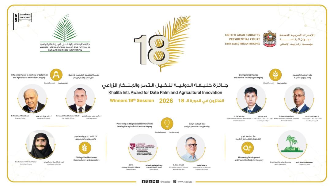 أعلنت جائزة خليفة الدولية لنخيل التمر والابتكار الزراعي عن أسماء الفائزين في دورتها الثامنة عشرة، وذلك خلال مؤتمر صحفي عُقد في مبنى مؤسسة زايد الخير بأبوظبي، بحضور نخبة من المسؤولين والخبراء والباحثين في قطاع الزراعة والابتكار الزراعي، إلى جانب ممثلي وسائل الإعلام المحلية والدولية.