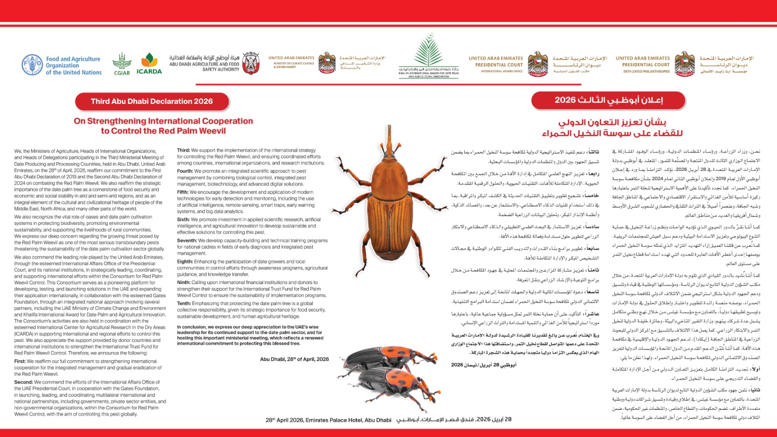 ويأتي الإعلان الذي تم اطلاقه عقب الاجتماع الوزاري رفيع المستوى المنعقد ظهر يوم الثلاثاء 28 ابريل 2026 بفندق قصر الامارات بابوظبي، امتداداً لما تحقق من خلال إعلان أبوظبي الأول لعام 2019 وإعلان أبوظبي الثاني لعام 2024، بما يعكس استمرار الزخم الدولي وتنامي الالتزام الجماعي بمواجهة آفة سوسة النخيل الحمراء، التي تُعد من أخطر الآفات العابرة للحدود المهددة لاستدامة قطاع نخيل التمر عالمياً.