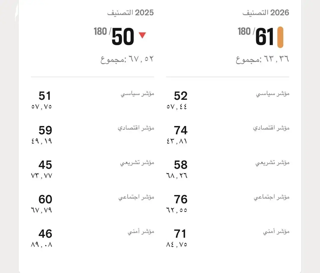 وبهذا التنصيف الصادر اليوم تراجعت موريتانيا من الرتبة 50 العام الماضي، إلى الرتبة 61، لتواصل بذلك مسار التراجع بعد أن خسرت العام الذي قبله 17 نقطة، متراجعة من الرتبة 33 إلى الرتبة 50.