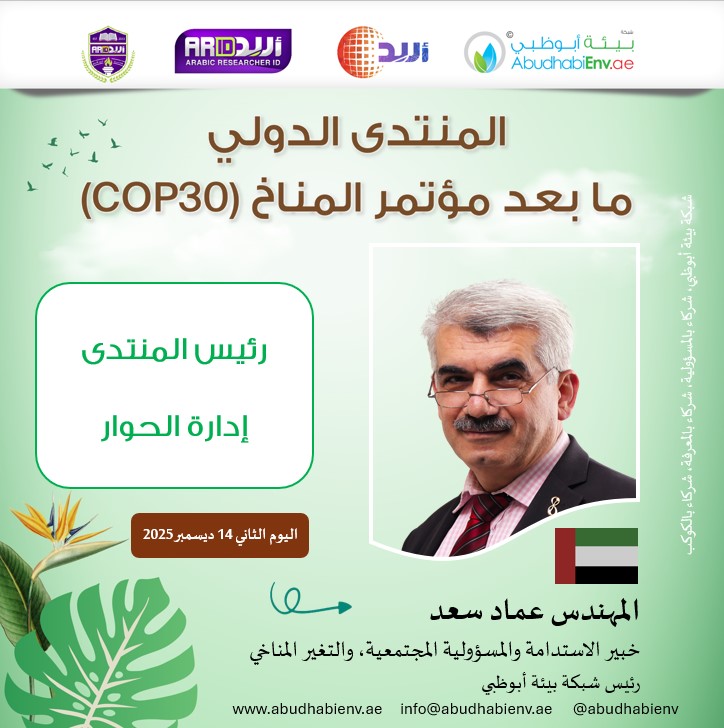 افتتحت شبكة بيئة أبوظبي، بالتعاون مع منصة أُريد الدولية، أعمال المنتدى الدولي للمناخ ما بعد مؤتمر الأطراف COP30، الذي عُقد عبر منصة زووم بتاريخ 13 ديسمبر 2025، بمشاركة نخبة من الباحثين والخبراء من تسع دول عربية، وبحضور رسمي رفيع المستوى عكس أهمية الحدث ومحوريته في المرحلة المقبلة من العمل المناخي.