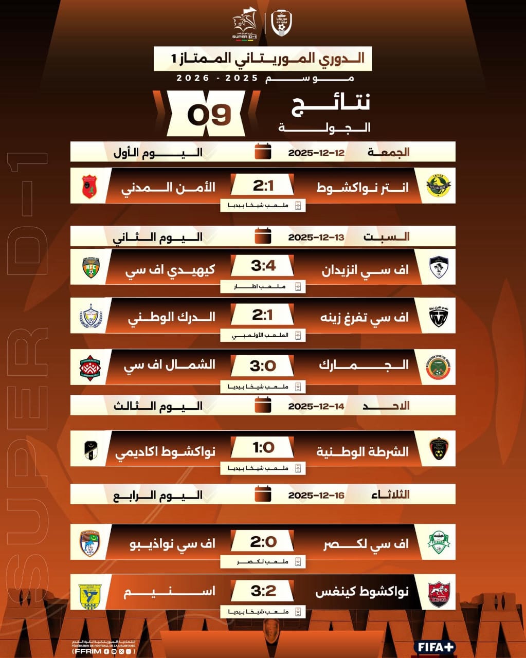 شهدت منافسات الجولة التاسعة من الدوري الوطني الموريتاني لكرة القدم مفاجآت ونتائج مثيرة، ترتب عنها تحسن ترتيب فريق الأمن المدني ليتعادل بالنقاط مع اف سي نواذيبو في المركز الثاني، بانتظار اكتمال المباريات.