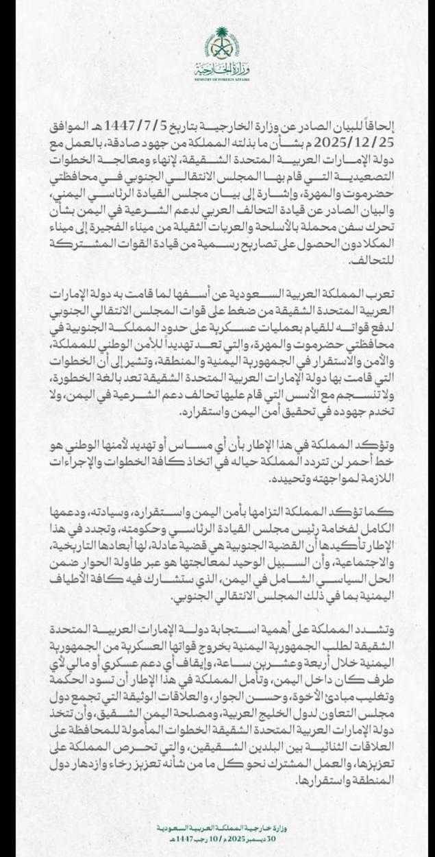 إلحاقاً للبيان الصادر عن وزارة الخارجية بتاريخ 1447/7/5 هـ الموافق 2025/12/25م بشأن ما بذلته المملكة من جهود صادقة، بالعمل مع دولة الإمارات العربية المتحدة الشقيقة، لإنهاء ومعالجة الخطوات التصعيدية التي قام بها المجلس الانتقالي الجنوبي في محافظتي حضرموت والمهرة، وإشارة إلى بيان مجلس القيادة الرئاسي اليمني والبيان الصادر عن قيادة التحالف العربي لدعم الشرعية في اليمن بشأن تحرك سفن محملة بالأسلحة والعربات الثقيلة من ميناء الفجيرة إلى ميناء المكلادون الحصول على تصاريح رسمية من قيادة القوات المشتركة للتحالف.