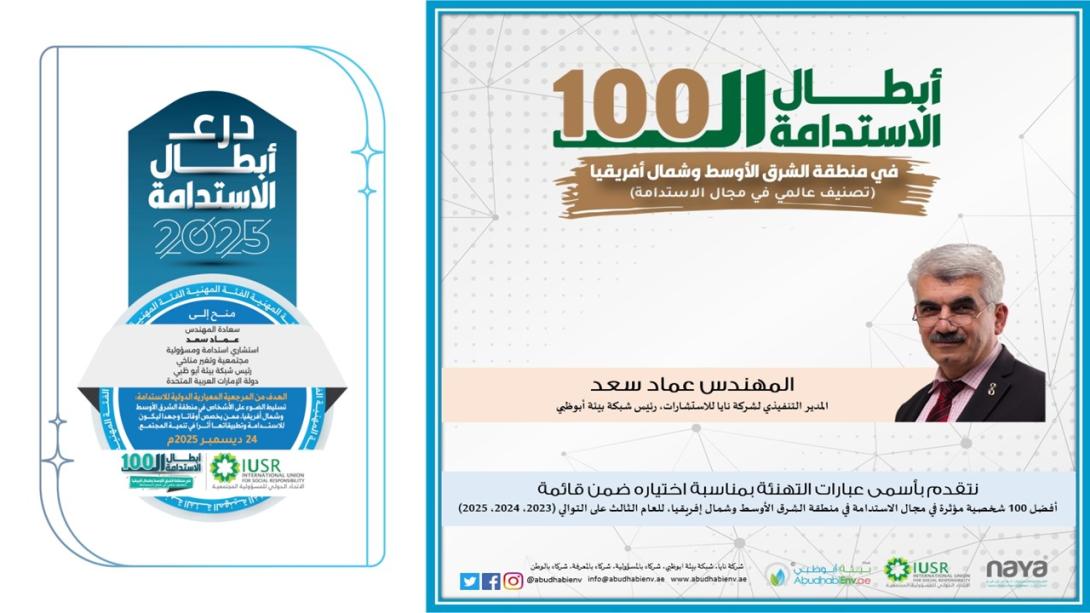 تحتفي شبكة بيئة أبوظبي اليوم بإنجاز عربي جديد، يتمثل في اختيار المهندس عماد سعد ضمن قائمة أبطال الاستدامة لعام 2025 في منطقة الشرق الأوسط وشمال إفريقيا، والتي يمنحها الاتحاد الدولي للمسؤولية المجتمعية، ويأتي هذا التكريم للعام الثالث على التوالي (2025 – 2024 – 2023)، في تأكيدٍ على دوره الريادي وتأثيره المستدام في قيادة الوعي البيئي والعمل المناخي في العالم العربي.