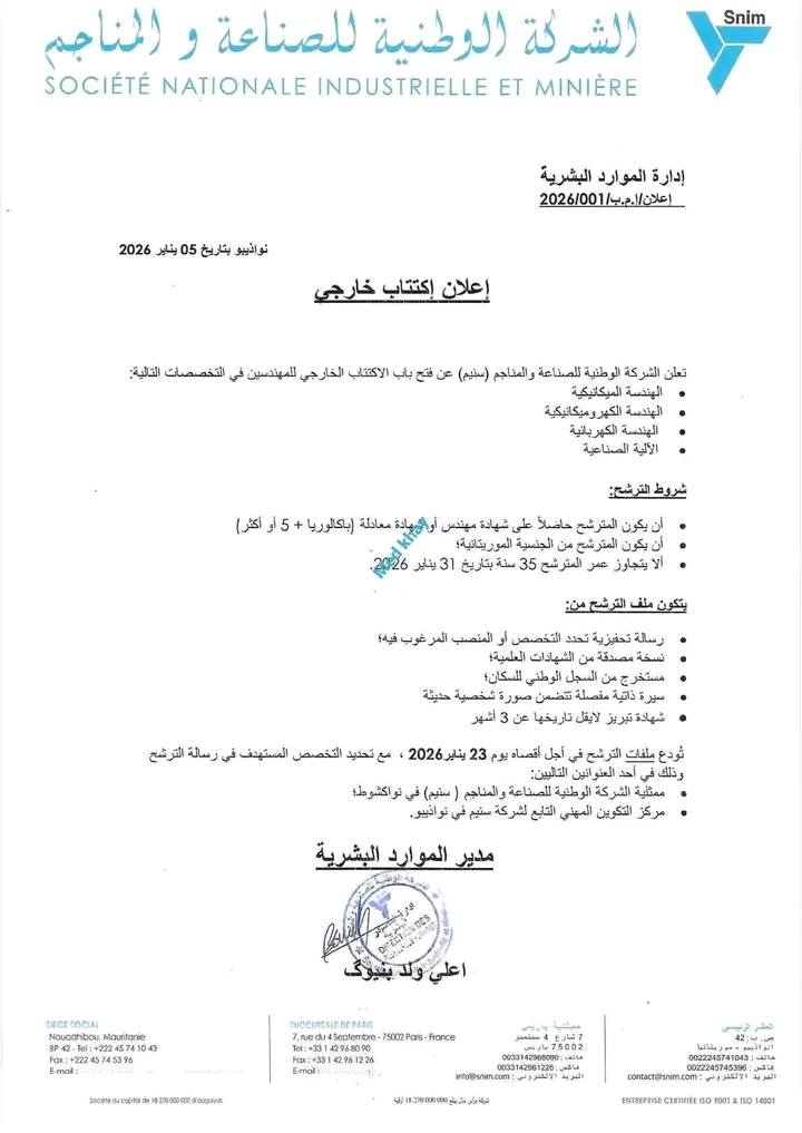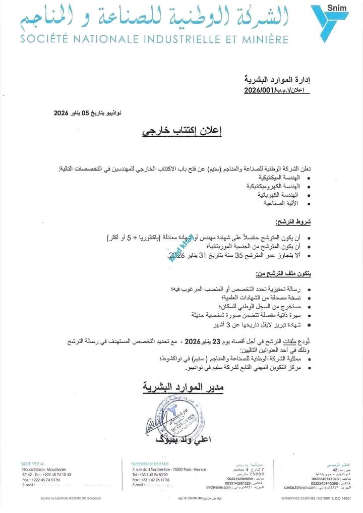 تعلن الشركة الوطنية للصناعة والمناجم (سنيم) عن فتح باب الاكتتاب الخارجي للمهندسين في التخصصات التالية: