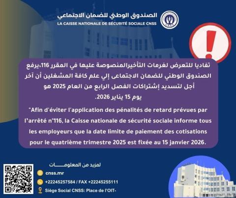 أعلن الصندوق الوطني للضمان الاجتماعي أنه، تفادياً لتطبيق غرامات التأخير المنصوص عليها في المقرر رقم 116، فإن آخر أجل لتسديد اشتراكات الفصل الرابع من سنة 2025 هو يوم 15 يناير 2026.