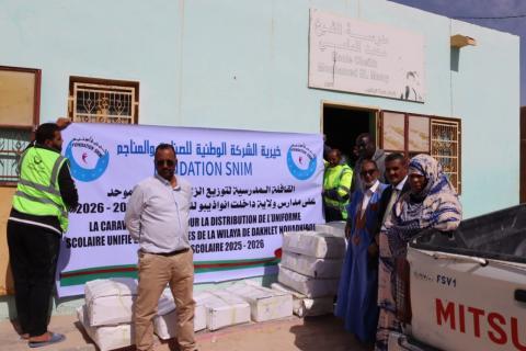 سلمت اليوم الاثنين 12/01/2026 خيرية الشركة الوطنية للصناعة والمناجم اسنيم بمنى ولاية داخلة انواذيبو 6650 قطعة من الزي المدرسي الموحد