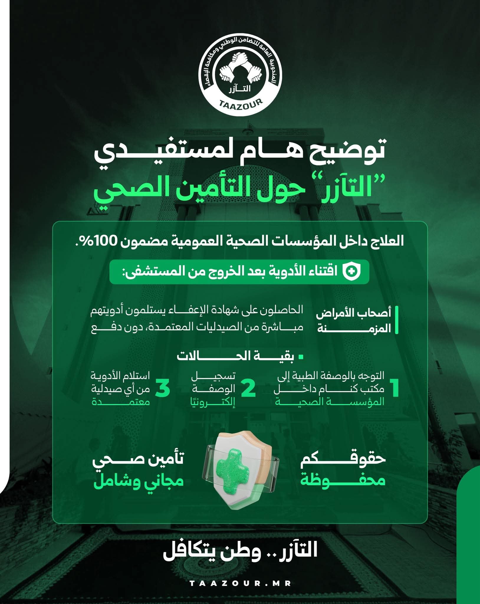 وأكدت “التآزر” أن هذا النظام يضمن تأمينًا صحيًا مجانيًا وشاملًا، ويحفظ حقوق المستفيدين بشكل محفّظ، في إطار تعزيز العدالة الاجتماعية وتحسين النفاذ إلى الخدمات الصحية.