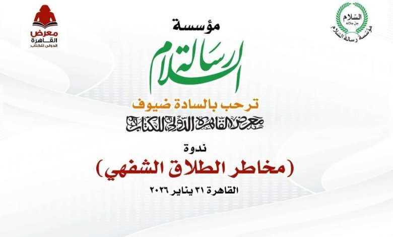 تتشرف مؤسسة ” رسالة السلام ” بدعوة سيادتكم لمشاركتها في ندوة ” مخاطر الطلاق الشفهى ” والتي تنظمها المؤسسة علي هامش مشاركتها في معرض القاهرة الدولي للكتاب .