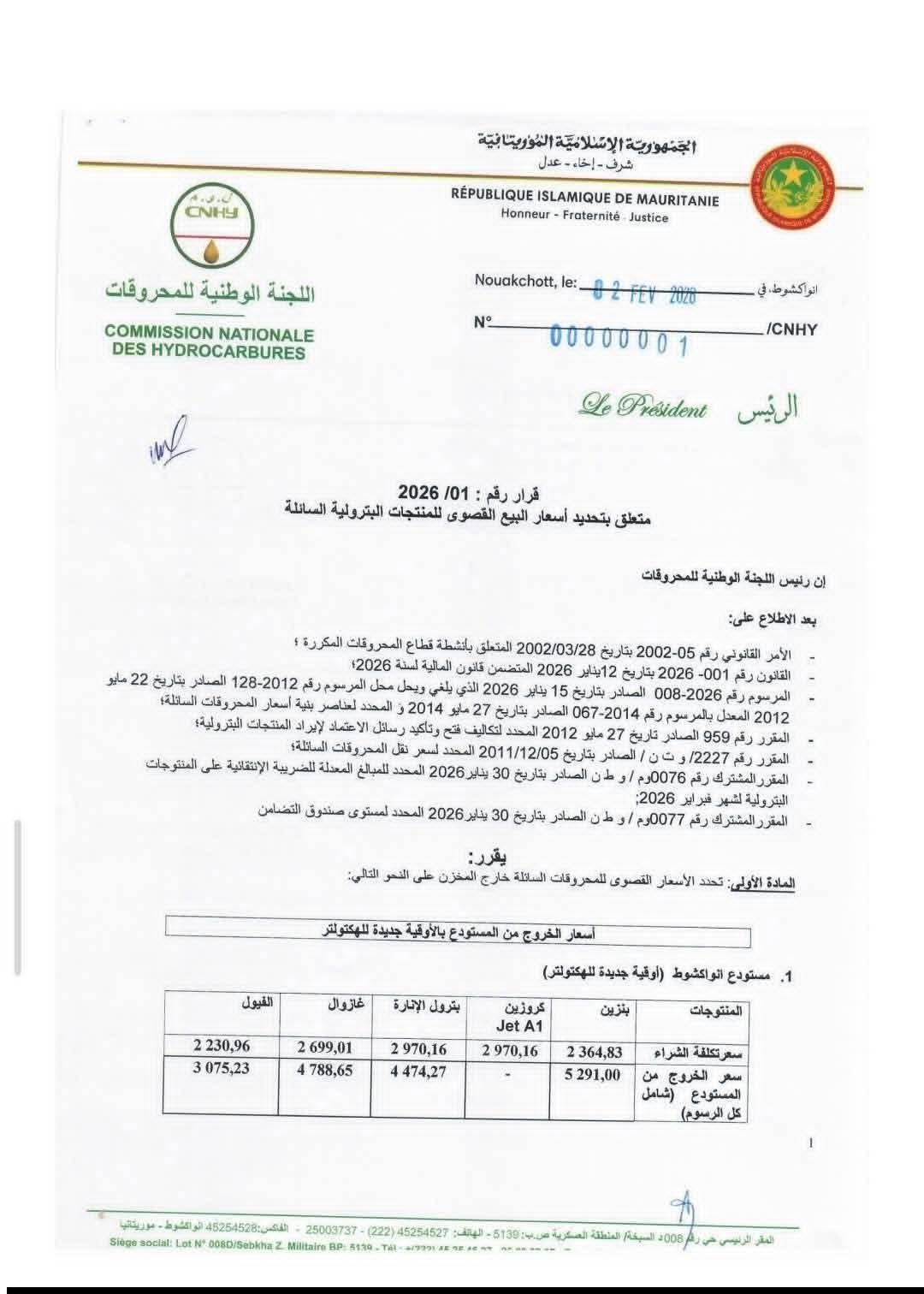 Feb 03 / التعليقات السلطات تعلن الأسعار الجديدة للمحروقات أعلنت اللجنة الوطنية للمحروقات الاثنين 02 فبراير الأسعار الجديدة للمحروقات، بعد دخول قرار تحرير أسعارها حيز التنفيذ. وتضمن القرار لائحة الأسعار الجديدة البنزين والبترول والغازوال لدى محطات التوزيع على عموم التراب الوطني.ويمكن الاطلاع على الأسعار الجديدة في الصور المرفقة. ثلاثاء, 2026/02/03 - 09:01