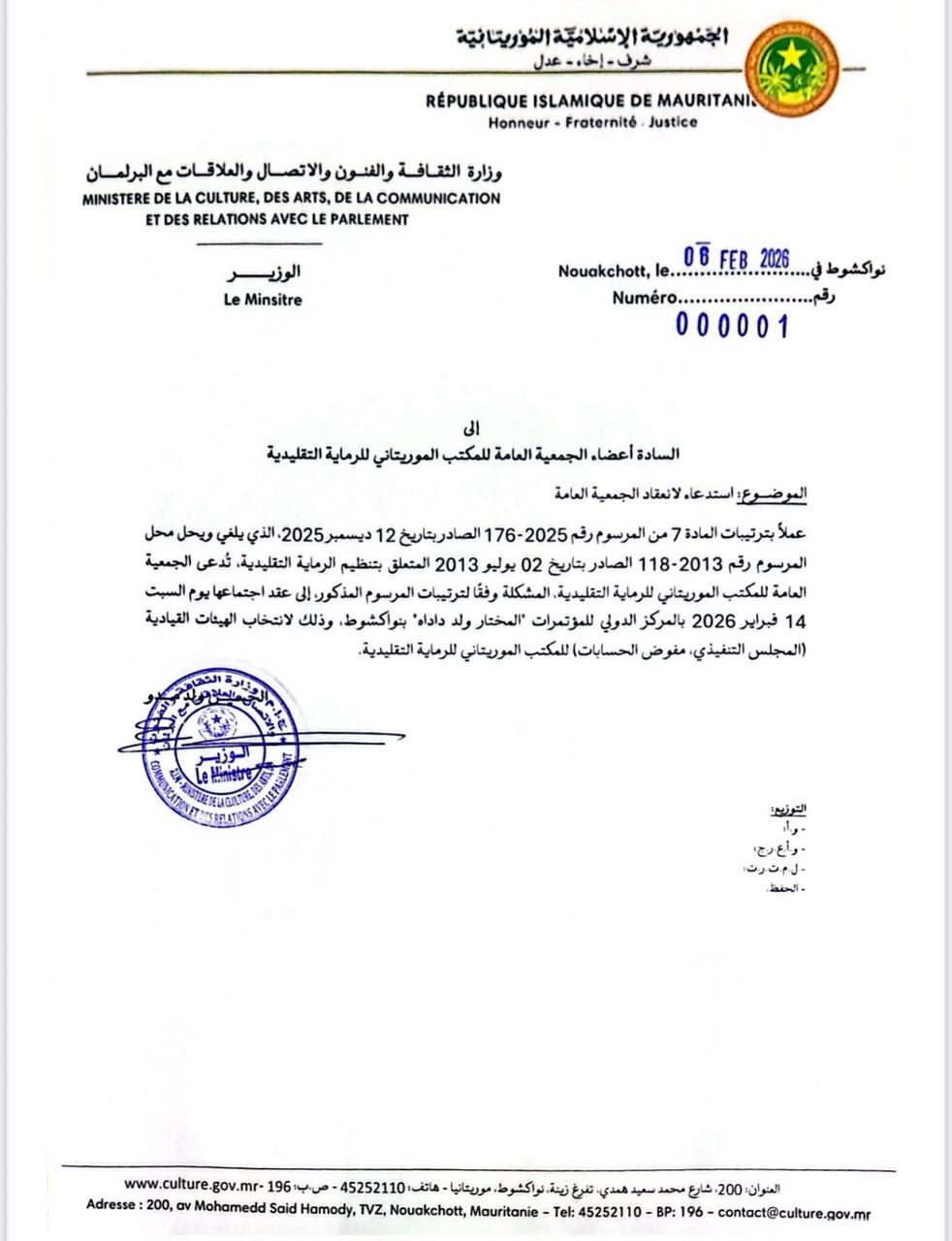 أعلنت الجمعية العامة للمكتب الموريتاني للرماية التقليدية عن موعد اجتماعها القادم، والذي سيعقد يوم السبت 14 فبراير بالمركز الدولي للمؤتمرات المختار ولد داداه في نواكشوط.