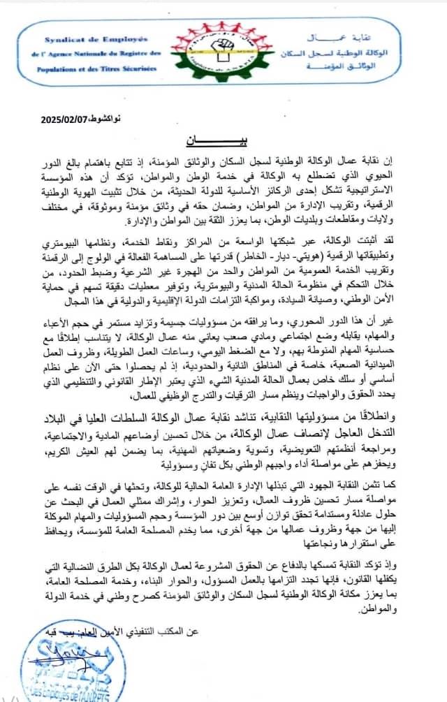 واختتم البيان بتأكيد تمسك النقابة بالدفاع عن الحقوق المهنية لعمال الوكالة بكل الوسائل القانونية والنقابية المشروعة، مع التشديد على الالتزام بالعمل المسؤول والحوار البناء، وخدمة الصالح العام، وتعزيز مكانة الوكالة الوطنية لسجل السكان والوثائق المؤمنة كصرح وطني في خدمة الدولة والمواطن.