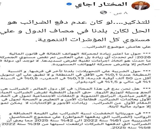 انتقد الوزير الأول المختار ولد اجاي، ضمنيا الجدل المثار بشأن القرار المتعلقة بجمركة الهواتف والضريبة على التحويلات في ميزانية 2026.