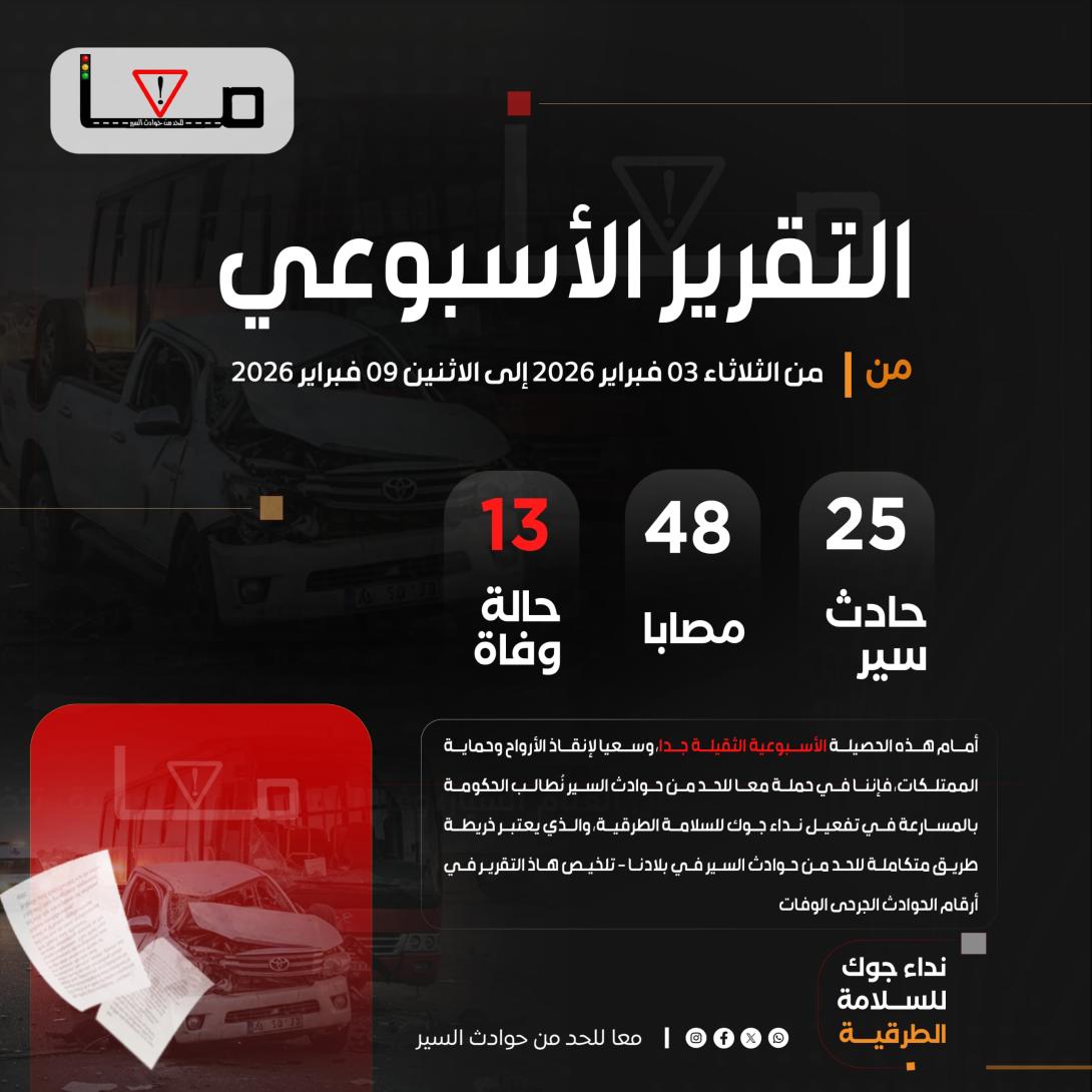 أمام هذه الحصيلة الأسبوعية الثقيلة جدا، وسعيا لإنقاذ الأرواح وحماية الممتلكات، فإننا في حملة معا للحد من حوادث السير نُطالب الحكومة بالمسارعة في تفعيل نداء جوك للسلامة الطرقية، والذي يعتبر خريطة طريق متكاملة للحد من حوادث السير في بلادنا.