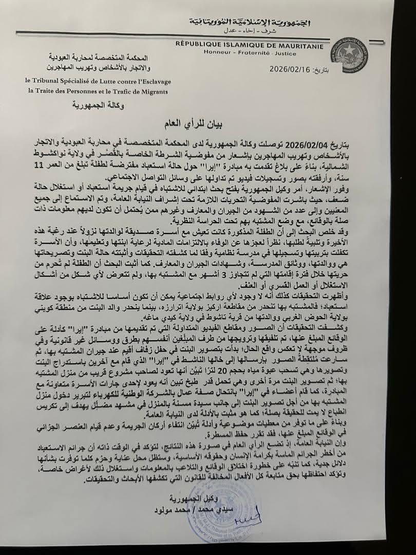 “بتاريخ 04-02-2026 توصلت وكالة الجمهورية لدى المحكمة المتخصصة في محاربة العبودية والاتجار بالأشخاص وتهريب المهاجرين بإشعار من مفوضية الشرطة الخاصة بالقُصَّر في ولاية نواكشوط الشمالية، بناءً على بلاغ تقدمت به مبادرة “إيرا” حول حالة استعباد مفترضة لطفلة تبلغ من العمر 11 سنة، وأرفقته بصور وتسجيلات فيديو تم تداولها على وسائل التواصل الاجتماعي.