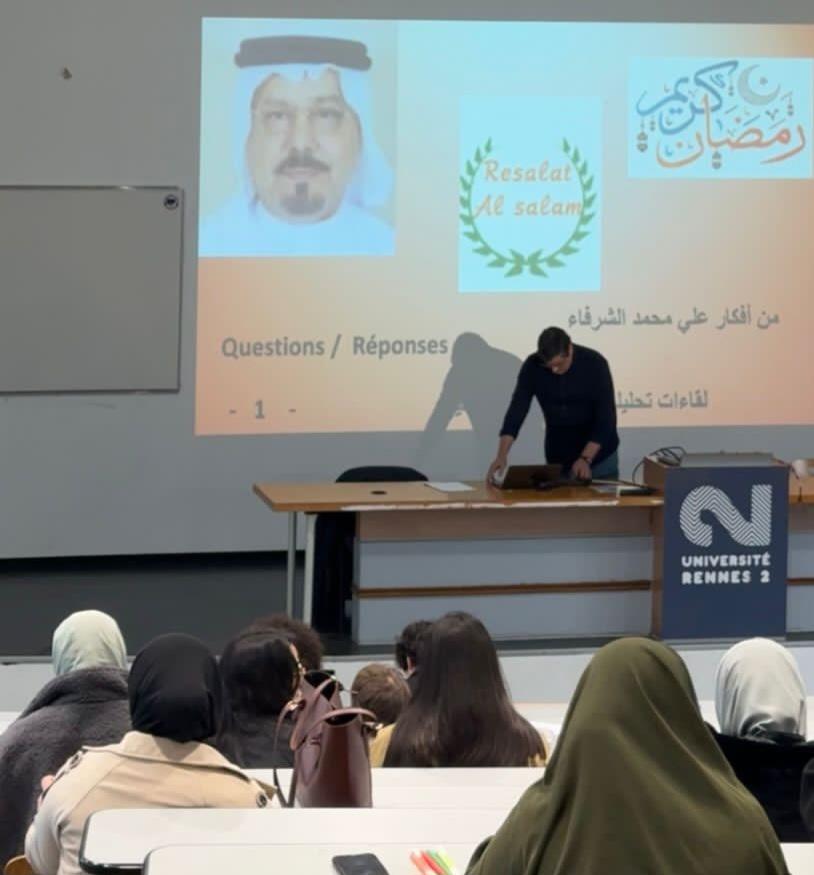 احتفالا بحلول شهر رمضان المبارك، نظم الدكتور شكرى الميموني، رئيس قسم الدراسات العربية بجامعة رين الفرنسية وممثل مؤسسة رسالة السلام بفرنسا لقاء مفتوحا للتعريف بفضائل الإسلام وسماحة القرآن الكريم، وذلك بحضور عدد من الطلاب والطالبات المهتمين بالحوار الثقافي والديني.