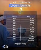 تتراوح أوقات الإفطار اليوم الأربعاء سابع أيام شهر رمضان المبارك 1447 هجرية، في عواصم الولايات الموريتانية ما بين 18:38 دقيقة في مدينة النعمة عاصمة ولاية الحوض الشرقي، و19:14 دقيقة في مدينة نواذيبو عاصمة البلاد الاقتصادية.