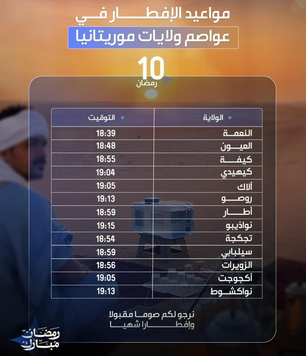 وهذه أوقات الإفطار في عواصم ولايات موريتانيا بالنسبة لليوم العاشر من شهر رمضان 1447 ه.