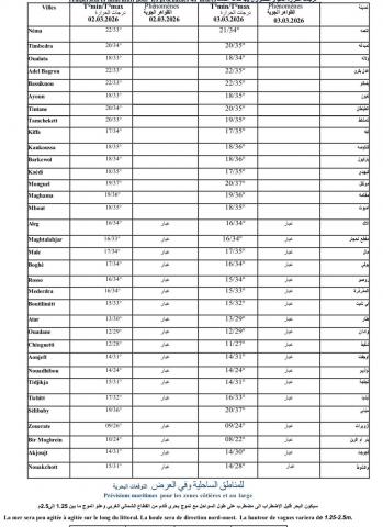 قالت الهيئة الوطنية للأرصاد الجوية إن الحالة الجوية العامة خلال 48 ساعة المقبلة ليومي 2و3 من مارس ستعرف انخفاضا في درجات الحرارة وتأثرا بالأتربة :